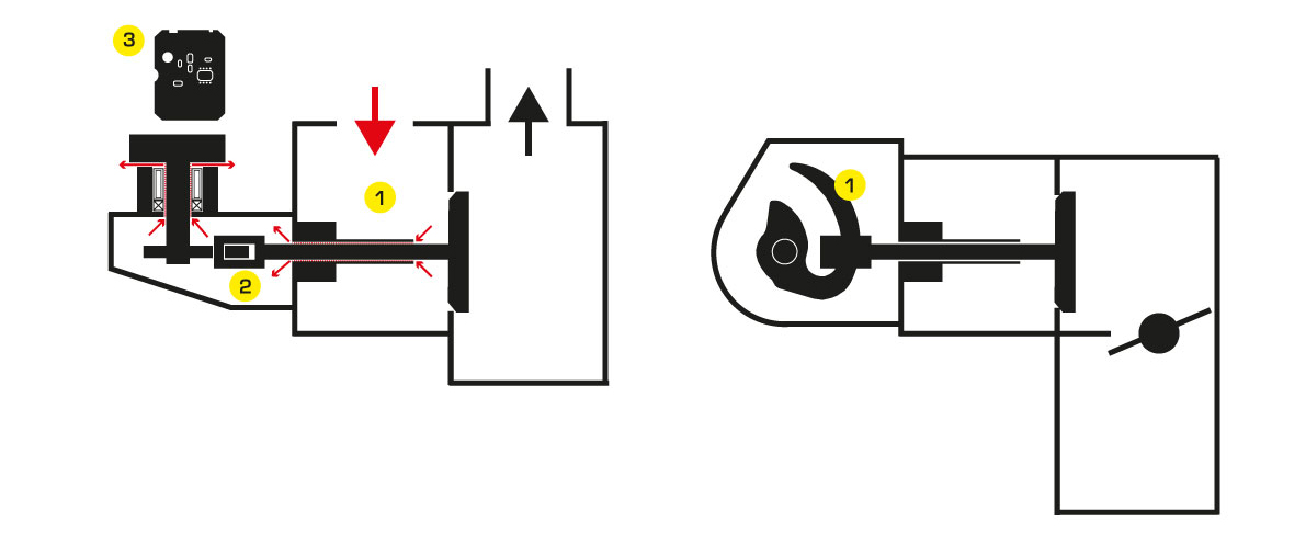 In der Kammer, in die die Abgase jetzt ihren Weg gefunden haben ist die Ventilführung mit dem Steuermechanismus-Positionierhaken verbunden (siehe Abbildung B, Pos. 1). Die Ventileinstellung wird durch Drehen des Hakens mit einem Elektromotor gesteuert. Die beiden Komponenten sind über eine Achse miteinander verbunden. Der Haken und die Elektronik zur Steuerung des Elektromotors befinden sich in separaten Fächern (siehe Abbildung A, Punkt 2 und Pos. 3) und das Abgas findet hier über die Achse zwischen Packdose und Nagellager von einer Kammer zur anderen.