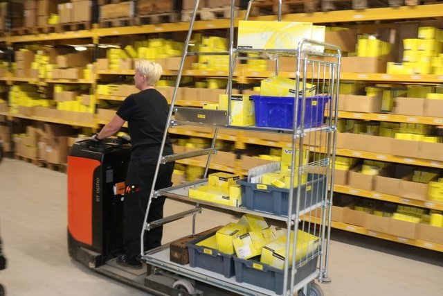 Zur Kommissionierung gesendete Aufträge werden automatisch an die Handscanner unserer fleißigen Logistikmitarbeiter verteilt und von ihnen initiiert. Die Handscanner wurden gerade aktualisiert, um unser neues drahtloses 5-GHz-Netzwerk zu unterstützen, das stabile und schnelle Kommunikation gewährleistet. Um die Kommissionierung von Kleinaufträgen effizienter zu gestalten, haben wir den Einsatz von Elektrofahrzeugen eingeführt, wodurch wir den Zeitaufwand weiter reduzieren konnten.