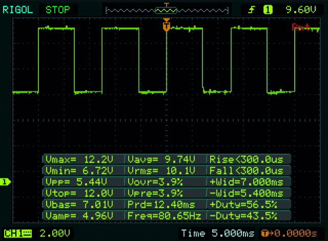 Здесь вы можете увидеть сигнал квадратной волны от датчика ABS с чипом эффекта Холла, способным подсчитывать зубы и определять направление вращения колеса